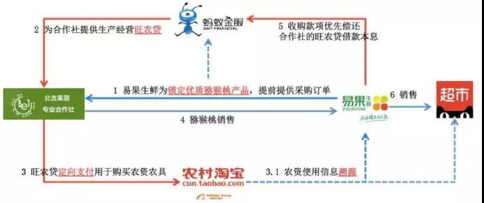 例如:天貓超市的供貨電商易果生鮮與陜西周至縣北吉果蔬專業(yè)合作社簽訂采購協(xié)議。螞蟻金服基于采購訂單,在對訂單進(jìn)行識(shí)別并確認(rèn)后,由網(wǎng)商銀行為合作社數(shù)百名果農(nóng)社員提供低息貸款,果農(nóng)拿到這筆貸款后,通過定向支付工具專項(xiàng)用于從農(nóng)村淘寶購買指定的農(nóng)藥、農(nóng)資、農(nóng)具。最后果品通過易果生鮮進(jìn)駐天貓超市進(jìn)行銷售。這種基于產(chǎn)業(yè)鏈形成的閉環(huán)信貸模式,突破了商業(yè)銀行傳統(tǒng)的評(píng)級(jí)授信要求,也無須另行提供抵押、質(zhì)押、擔(dān)保,提供的資金效率高、環(huán)節(jié)更簡單,利率則遠(yuǎn)低于民間借貸。
