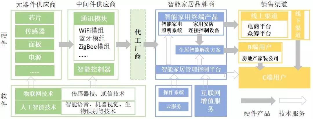 通常所指的智能家居企業(yè)為智能家居品牌商,涵蓋向最終用戶提供終端產(chǎn)品、解決方案和設(shè)備管理控制平臺的企業(yè),底層除物聯(lián)網(wǎng)操作系統(tǒng)、云服務(wù)作為管理控制平臺的支撐外,還包括內(nèi)容服務(wù)、生活服務(wù)等互聯(lián)網(wǎng)增值服務(wù)。智能家居產(chǎn)業(yè)鏈上游主要是芯片、傳感器等元器件供應(yīng),以及通訊模塊和智能控制器等中間件供應(yīng)商。品牌商可以通過線上、線下零售渠道直接向C端用戶銷售終端產(chǎn)品,也可以面向房地產(chǎn)、家裝公司等B端客戶提供整體解決方案。