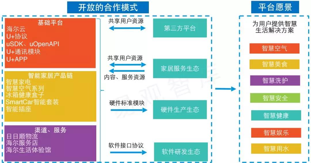 海爾U+智慧生活平臺是海爾集團旗下全開放、全兼容、全交互的智慧生活平臺。海爾作為最早布局智能家居市場的企業(yè),自2014年發(fā)布U+智慧生活戰(zhàn)略以來,海爾U+從智能家電產(chǎn)品出發(fā)逐步構(gòu)建起全場景智慧生活解決方案。通過與美國GE Appliances、新西蘭Fisher & Paykel、卡薩帝、統(tǒng)帥、日本AQUA等品牌整合,其智能產(chǎn)品體系覆蓋基本全面。
