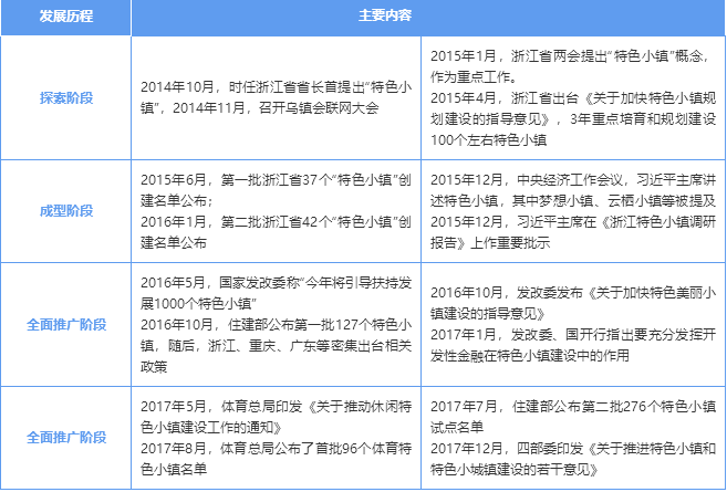改革開放以來,我國特色小鎮(zhèn)經(jīng)歷了三個發(fā)展階段:第一階段即探索階段,2014年浙江省省長李強首提“特色小鎮(zhèn)”;第二階段為成型階段,習近平在《浙江特色小鎮(zhèn)調(diào)研報告》上做了重要批示;第三階段為全面推廣階段,這個階段特點為國家發(fā)布引導政策,隨后地方政策密集出臺,全國各地特色小鎮(zhèn)建設如火如荼。