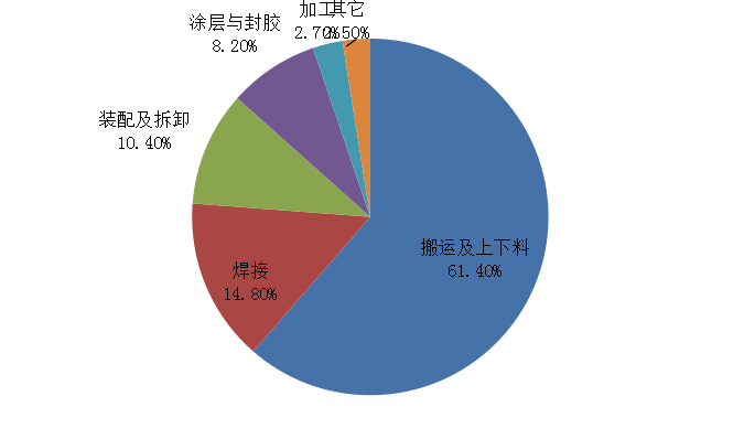 在國產工業(yè)機器人市場中,搬運及上下料銷量同比增長40.8%,占比達61.4%;焊接銷量同比增長9.7%,占比達14.8%;裝配及拆卸銷量同比增長5.4%,占比達10.4%。