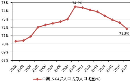 近年來,中國人口結構發(fā)生了巨大變化,15-64歲勞動適齡人口占總人口的比重自2011年以來呈現逐步下滑的趨勢,2017年該比重已經下滑至71.8%,相比2010年的最高點降低了2.7個百分點。另外,中國社會的老齡化問題更加嚴重,中國人口紅利逐步消失,目前已經出現了劉易斯拐點。人口結構的變化,勞動力供給條件的變化顯著的推高了我國的勞動成本,不僅削弱了制造業(yè)的競爭力,對勞動密集型的產業(yè)同樣也帶來了嚴峻的挑戰(zhàn),也削弱了中國產品在全球市場的競爭力。