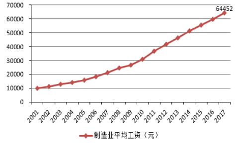 除了未來勞動力不足之外,中國制造業(yè)員工的平均工資則呈現逐年增長的態(tài)勢,2017年已升至64452元,同比增長8.4%。勞動力成本不斷上升,用機器人代替人工也是更加經濟、符合市場規(guī)律的必然選擇。目前,“世界工廠”正不斷的從中國向東南亞等其他國家和地區(qū)轉移,中國改革開放初期借助人口紅利快速發(fā)展的條件已然不復存在。解決勞動力不足、勞動力成本上升的主要途徑就是智能制造,即生產過程的自動化、智能化產業(yè)升級。未來通過產業(yè)的轉型升級更加注重質量和效益的提升,“機器代人”的生產方式將會更加普遍。