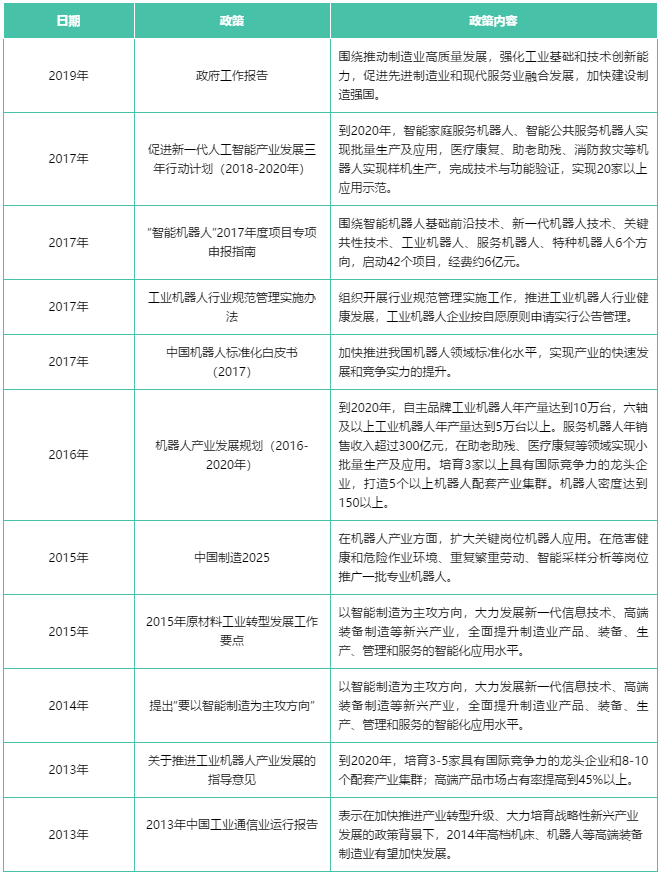 智能制造是“中國制造2025”發(fā)展規(guī)劃的重要發(fā)展方向,是未來制造業(yè)發(fā)展的必然趨勢,工業(yè)機器人是智能制造的關鍵設備,行業(yè)發(fā)展?jié)摿薮?。近年來,國家出臺了一系列的政策支持和鼓勵中國工業(yè)機器人行業(yè)的發(fā)展。根據2016年國務院發(fā)布的《機器人產業(yè)發(fā)展規(guī)劃(2016-2020年)》,到2020年,我國工業(yè)機器人產量達到10萬臺,六軸及以上工業(yè)機器人年產量達到5萬臺以上;培育3家以上具有國際競爭力的龍頭企業(yè);機器人密度達到150以上。