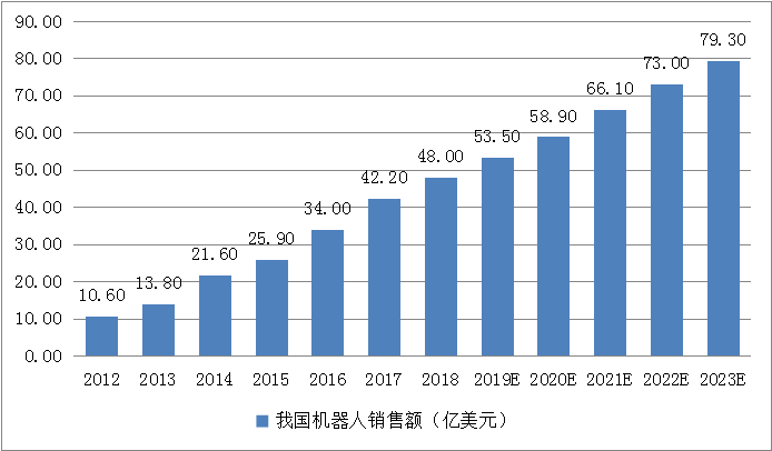 2018年,我國工業(yè)機器人銷售額達48億美元,同比增長24.1%。未來隨著生產方式向柔性、智能、精細轉變,對工業(yè)機器人的需求將呈現大幅增長。根據前瞻產業(yè)研究院的預測,到2023年,國內市場規(guī)模將翻一番,進一步擴大到79.3億美元。