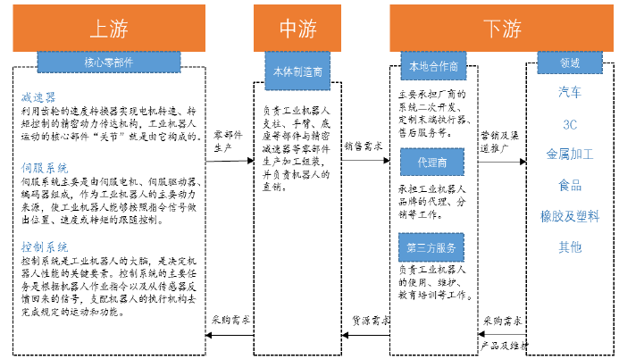 下游為系統(tǒng)集成商,可用于焊接、切割、搬運、上下料、涂層、封膠等生產制造領域。目前在系統(tǒng)集成服務的市場化應用方面鞏固優(yōu)勢逐步趕超外資品牌,在行業(yè)快速發(fā)展的大背景下國產品牌有望逐步崛起。拓斯達、敖博機器人、上海歡顏和珞石機器人等企業(yè)均是工業(yè)機器人領域的新貴。