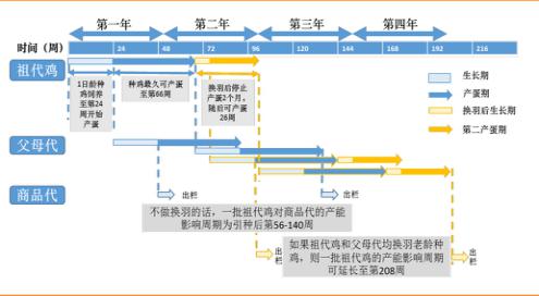 理論上,從1日齡祖代引種到商品代毛雞出欄,共需約15-16個月。具體而言: