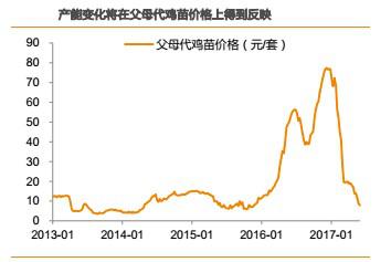 引種規(guī)模的下降意味著祖代存欄的下降,供給的減少將導(dǎo)致父母代雞苗銷售價格下降。由于2012年以前國內(nèi)白羽肉雞需求快速增加,因此,國內(nèi)白羽雞引種規(guī)增速的下降也會引起價格的上漲。例如,2010年的引種規(guī)模與2009年基本持平,僅增長3萬套。受此影響,父母代雞苗價格也從2010年9月份開始反彈。同樣的,隨著2014年引種規(guī)模的下降,父母代雞苗價格則從2014年3月見底回升,中間雖有波動,但從2015年10月即開始一輪快速上漲。也就是說,對于祖代產(chǎn)能的變化,父母代雞苗價格是一個重要的驗證指標(biāo)。