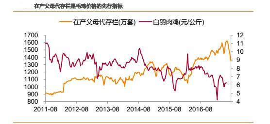 在產(chǎn)父母代存欄是商品代的直接產(chǎn)能,代表了中短期的供給能力。理論上,經(jīng)過3周孵化期+6 周育肥期后毛雞出欄,則在產(chǎn)父母代存欄是毛雞價格提前9-10周的先行指標(biāo),與毛雞價格走勢呈反相關(guān)。從實際運行來看,理論上走勢與實際走勢大體吻合。因此,在產(chǎn)父母代存欄是相對于毛雞價格提前兩個多月的先行指標(biāo)。
