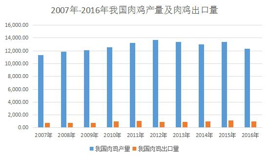 從2007年開始,受H7N9疫情和成本快速上升等因素的困擾,中國雞肉生產(chǎn)進(jìn)入了平穩(wěn)發(fā)展時期,雖然增長速度有所減緩,但是增長趨勢依然強(qiáng)勁。2007年至2012年,我國雞肉年產(chǎn)量及消費量持續(xù)增長,2013年以來受疫情、中央八項規(guī)定等因素的影響,雞肉年產(chǎn)銷量略有下降,但始終保持在1,300萬噸以上的水平。雞肉產(chǎn)量從2007年的11291千噸增長至2016年的12300千噸,雞肉消費量從2007年的11773千噸增長至2016年的12730千噸。