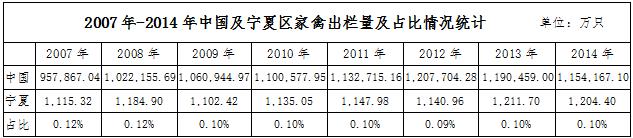 依據(jù)wind數(shù)據(jù),2014年全國家禽出欄量1154167.1萬只,寧夏地區(qū)家禽出欄量達(dá)1204.4萬只,占全國出欄量的0.1%。自2007年以來,寧夏地區(qū)的家禽出欄量一直以0.1%~0.12%的全國占比,市場占比非常小。