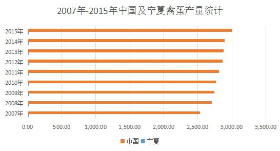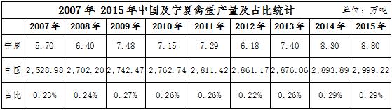 寧夏不僅是在出欄量上所占比重較低,在產(chǎn)量上也并不樂觀。2015年底,中國總體禽蛋產(chǎn)量為2999.22萬噸,而寧夏僅8.8萬噸,占全國的0.29%。2007年以來,寧夏禽蛋產(chǎn)量占比在0.23%~0.29%之間,2014年占比達(dá)到最高。