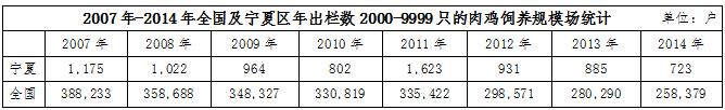 不僅如此,在肉雞飼養(yǎng)場的規(guī)模上也有明顯的差距。據(jù)wind數(shù)據(jù)統(tǒng)計,2014年,寧夏區(qū)內(nèi)肉雞年出欄數(shù)在1-1999只的肉雞飼養(yǎng)規(guī)模場戶數(shù)為133734戶,當(dāng)年全國同規(guī)模的飼養(yǎng)場戶數(shù)高達(dá)21644679戶,占比為0.62%;年出欄數(shù)在2000-9999只的肉雞飼養(yǎng)規(guī)模戶數(shù),寧夏地區(qū)為723戶,全國為258379戶,占比0.28%;年出欄數(shù)在10000-49999只的肉雞飼養(yǎng)規(guī)模戶數(shù),寧夏地區(qū)為91戶,全國為132780戶,占比為0.07%。