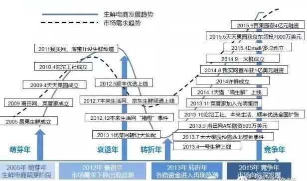 2005年,易果網(wǎng)成立,2008年,出現(xiàn)了專注做有機食品的和樂康及沱沱工社,這幾個企業(yè)都專注于小眾市場。在此期間,國內(nèi)頻發(fā)食品安全事件,導(dǎo)致很多消費者產(chǎn)生了對高品質(zhì)、高安全性食材的需求,這使得很多企業(yè)看到了生鮮這個巨大市場,在2009年-2012年之間,涌現(xiàn)了一大批生鮮電商。過多的商家進入這個行業(yè),也導(dǎo)致了行業(yè)泡沫的產(chǎn)生,當(dāng)時的市場需求并沒有那么大,加上冷鏈物流及信息技術(shù)水平不配套,而生鮮電商的模式也是原封不動的COPY了普通電商的模式,最終導(dǎo)致了很多企業(yè)倒閉。