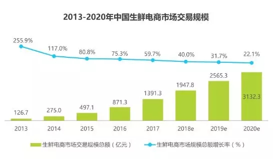 2017年中國生鮮電商市場交易規(guī)模約為1391.3億元,同比增長59.7%,預(yù)計2020年,生鮮電商交易規(guī)模可以達到3132億元。一方面基于消 費者消費習(xí)慣養(yǎng)成,另一方面基于冷鏈和倉儲系統(tǒng)迅速完善。