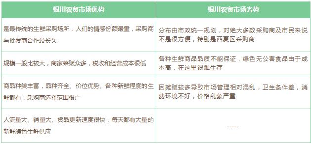 在銀川本地,主城范圍內(nèi)除最早建立的北環(huán)批發(fā)市場外,再沒有專業(yè)的大型生鮮批發(fā)市場,近幾年發(fā)展起來的有:四季鮮果蔬批發(fā)市場、21世紀(jì)冷鏈批發(fā)市場、海吉星農(nóng)副產(chǎn)品物流園、潤恒農(nóng)產(chǎn)品市場等都在郊區(qū)。大型農(nóng)產(chǎn)品交易市場是傳統(tǒng)生鮮流通中不可缺少的一環(huán),是各社區(qū)農(nóng)貿(mào)市場及超市生鮮尤其是蔬菜水果的主要來源,具有成交量大、知名度高、社會影響大、流通體系健全、配套完整等優(yōu)勢,但也存在傳統(tǒng)生鮮流通方式的不足。